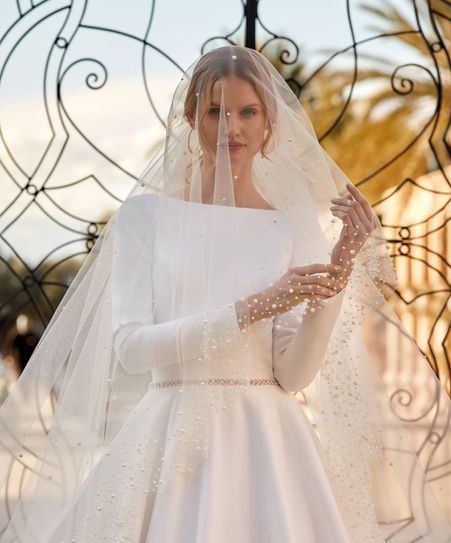 The epitome of understated old world glamour, this luxurious and sophisticated Princess cut gown features a Bateau neckline, long sleeves and seductive low back that gives way to cascading buttons that flow down to the hem of the train. Delicate beading highlights the waistline.