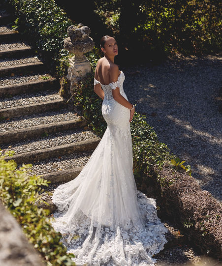 Romantic sequined corded lace combines to create classic elegance with this fit and flare wedding dress. With an illusion bodice that gives off a sexier feel, the timeless sweetheart neckline is paired with detachable off the shoulder straps to create a versatile look. Lace appliqués are hand placed throughout the bodice, cascade down the sculpted stretch crepe skirt, and continue along the hem to reveal a stunning scalloped cathedral length train. For brides wanting a more traditional look, this style is also available with a fully lined bodice.