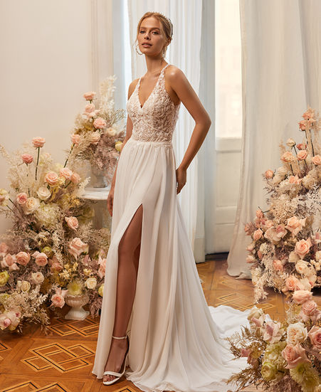 Have fun on your wedding day and look flawless while you dance, sing, and celebrate the night away in Moonlight Tango Style T968. A casual bridal gown that can be dressed up or down, this airy A-line look will be one you’ll never forget. A stunning sheer halter neck is carefully layered with a delicate lace fabric and intricately beaded embroidered floral lace appliques that provide chic coverage as they sparkle with a dazzling array of sequins and beading. Follow these beaded floral straps around the nape to a ravishing illusion keyhole racer back that cuts in at the shoulders to shows the perfect amount of skin. Balancing the intricate bodice details is a lightweight A-line chiffon skirt that moves with ease and features a sexy side skirt slit that shows off your legs with every step. Finished with a dainty row of buttons along the zipper and manageable sweep train, make your way down to the altar to happily ever after. Take your vows in stunning color options of Ivory with Rose net and all Ivory.